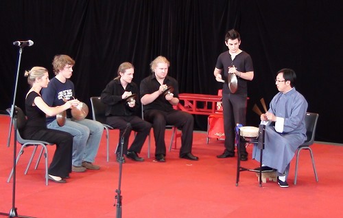 外国学生在戏曲学校老师的指导下学习使用京剧乐器