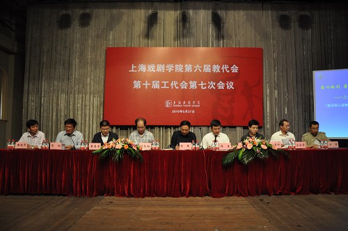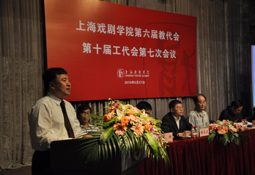 5月27日,我校第六届教代会、第十届工代会第七次会议在新空间召开。大会主席团成员楼巍、韩生、刘志钢、孙惠柱、黄昌勇、宫宝荣、葛朗、谢建平、卢昂出席会议并在主席台就座。全体教代会正式代表、列席代表、特邀代表出席大会。会议由校务委员会副主任、工会主席葛朗主持。