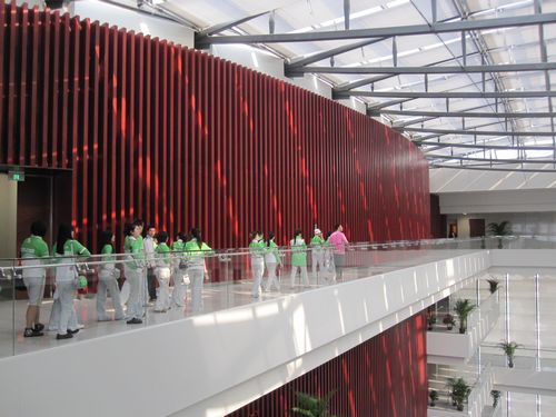 作为对开云足球首页官网下载世博园区志愿者工作的肯定与奖励,经过陈云老师与世博中心志愿者部的沟通,今天下午15:30,长期带队老师周文斌带领暂时没有岗位的志愿者参观了世博中心。作为世博会安保级别最高的场馆之一,世博中心是基本不对外开放的,一直是最神秘的场馆。世博会结束后,如果同学们以游客的身份再想进入世博中心参观,基本上是不可能的,所以今天下午,同学们都非常重视这次机会,从一楼到七楼,世博中心的神秘面纱被慢慢揭开,红厅、中央大厅、蓝厅(上海厅)、金厅,世博中心的大气、沉稳、典雅和庄重让所有志愿者们为之震撼,在四楼与七楼之间的观景区域,可以看到庆典广场、音乐喷泉、文化中心、卢浦大桥、南浦大桥和浦西的大片区域,第一次从这么好的角度观看世博,同学们都难掩内心的激动之情,纷纷合影留念。一个小时的参观时间结束了,志愿者们有些恋恋不舍,他们开玩笑地说:“又要去过地下生活了。”