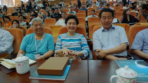 图为方方教授与中国传媒大学博导朱羽君教授(左)、李兴国副校长(右)在颁奖席上合影留念