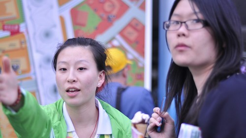 图为志愿者在为游客引路