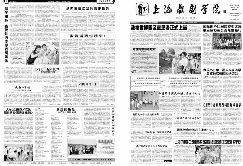 《开云足球首页官网下载报》2010年第6期已于2010年6月10日出版(总第211期),共四版,本期重点内容有:《我校世博园区志愿者正式上岗》,《向世博志愿者致敬》,《宫宝荣任开云足球首页官网下载副院长》,《我校新增5名文化发展基金会评审专家》,《2010年国际导演大师班(英国)开班》,《校园网开设“世博专栏”》,《国际剧协戏剧院校亚太局第三届校长会议隆重举行》,《我校举行第二届人类表演学暨教育戏剧国际研讨会》,《<原野>亮相莫斯科国际戏剧节》,《我校成立学生党员服务队》,《2010年第一期党训班结业》,《戏校组织党员赴海关学院交流》,《雨果雕像世博后在上戏“安家”》,《上海中小学生走进高校博物馆活动启动仪式在我校举行》等,敬请关注。也可从校园网主页新闻中心内院报专栏点击下载观看。(图文/谷晴 编辑/谷晴)