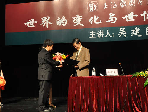 9月7日下午,中华人民共和国原驻法大使、国际博览局名誉主席、著名外交家吴建民院士,应我校邀请在上戏剧院举办题为“世界的变化与世博会的机遇”专题讲座。吴建民院士名誉教授聘任仪式同时举行,我校韩生院长为吴院士颁发了名誉教授证书。聘任仪式和讲座由我校党委书记楼巍主持。