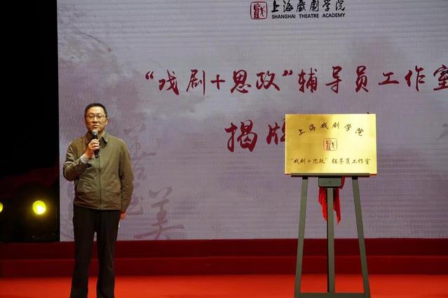 最后一个环节是上海戏剧学院“戏剧+思政”辅导员工作室的揭牌仪式,由上海戏剧学院党委书记谢巍揭牌并致辞。