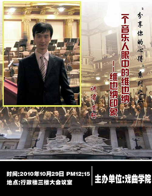 戏曲学院继上月末举办了“分享你的心得”系列讲座之一后,受到了许多老师们的欢迎和认同。将于本月29日在莲花路校区再次推出“分享你的心得”系列讲座之二,由戏曲学院听觉艺术展示专业青年教师黄轲主讲的“一个音乐人眼中的维也纳――维也纳印象”。