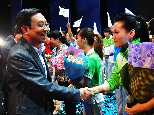 图为楼书记与谭晶亲切握手