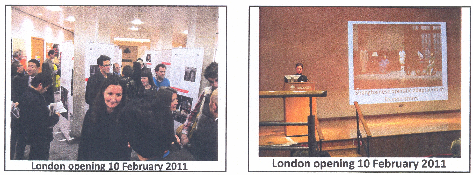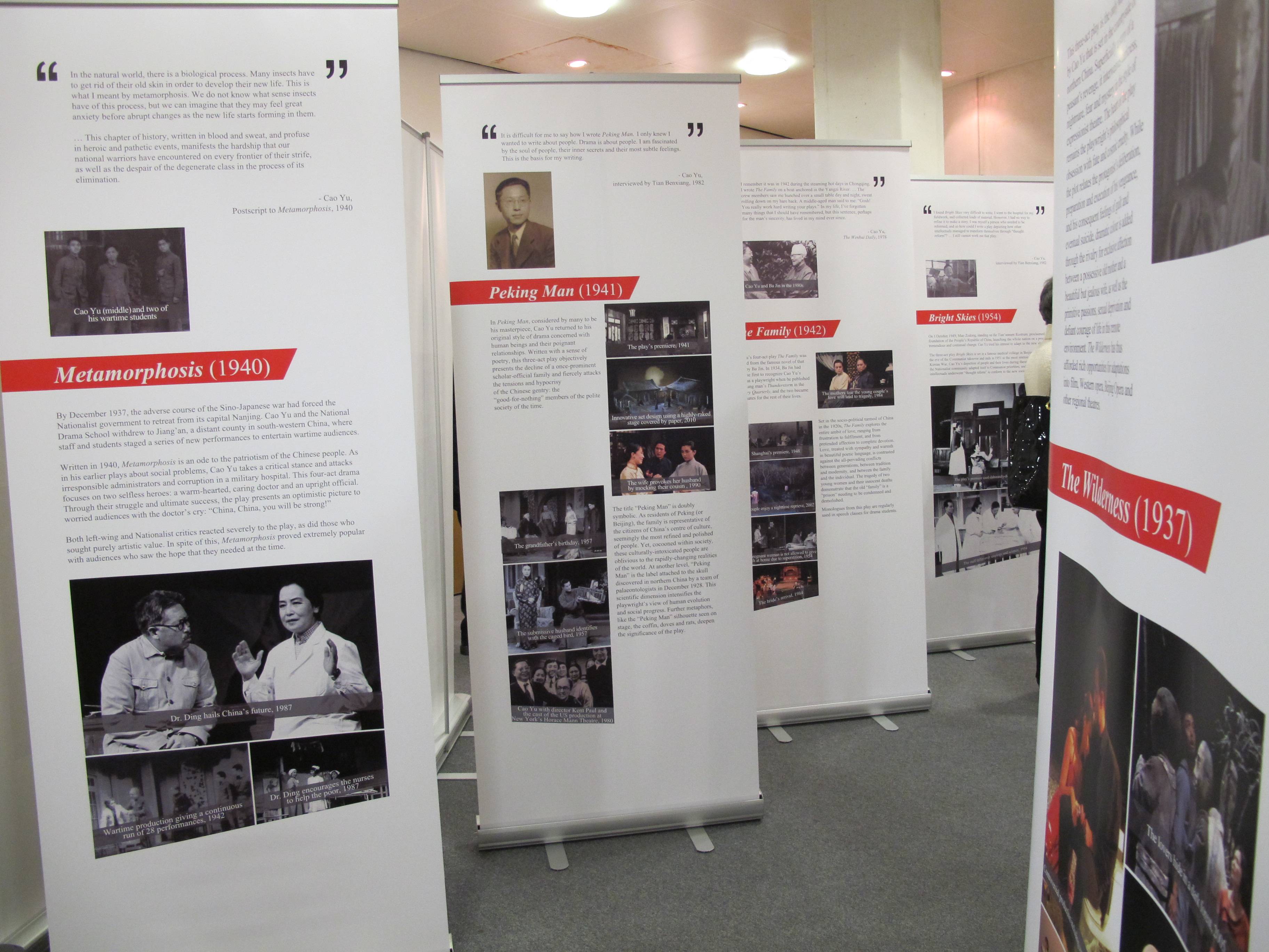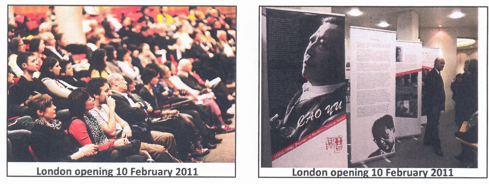 2011年2月10日,由我院戏剧博物馆与英国白玫瑰东亚研究中心/利兹大学东亚系、北京人民艺术剧院戏剧博物馆等合作主办的“曹禺:中国现代戏剧的先锋”——纪念曹禺诞辰100周年摄影展览在伦敦亚非学院开幕。中国驻英国使馆公使衔文化参赞吴逊、孔子学院院长张新生、利兹大学李如茹教授、尤德爵士夫人(Lady Youde),以及来自英国文化协会、大英博物馆、大英图书馆等文化界的百余位重要嘉宾出席。随后,展览和“曹禺生活与作品”的演讲、戏剧演出《太阳不是我们的》系列活动于3月21日在利兹继续进行。吴逊公参、曼城中国领事馆总领事倪坚、教育领事傅恒升专程前往利兹参加此次展览、演出活动。倪总领事在讲话中表示,他很高兴,中国现代戏剧能够使英国普通民众感兴趣。利兹大学副校长Richard Williams在展览开幕式上说,利兹大学非常荣幸能够和中国这样一位伟大的戏剧家有如此密切的联系。