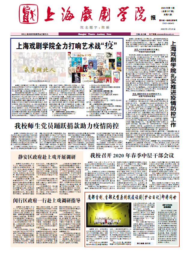 《上海戏剧学院报》2020年第1期(总第317期)已于2020年4月20日出版。重点内容有:《上海戏剧学院全力打响艺术战“疫”》《上海戏剧学院扎实推进疫情防控工作》《我校师生党员踊跃捐款助力疫情防控》等。敬请关注,也可点击下载阅读。(文、图、编辑:榕树)