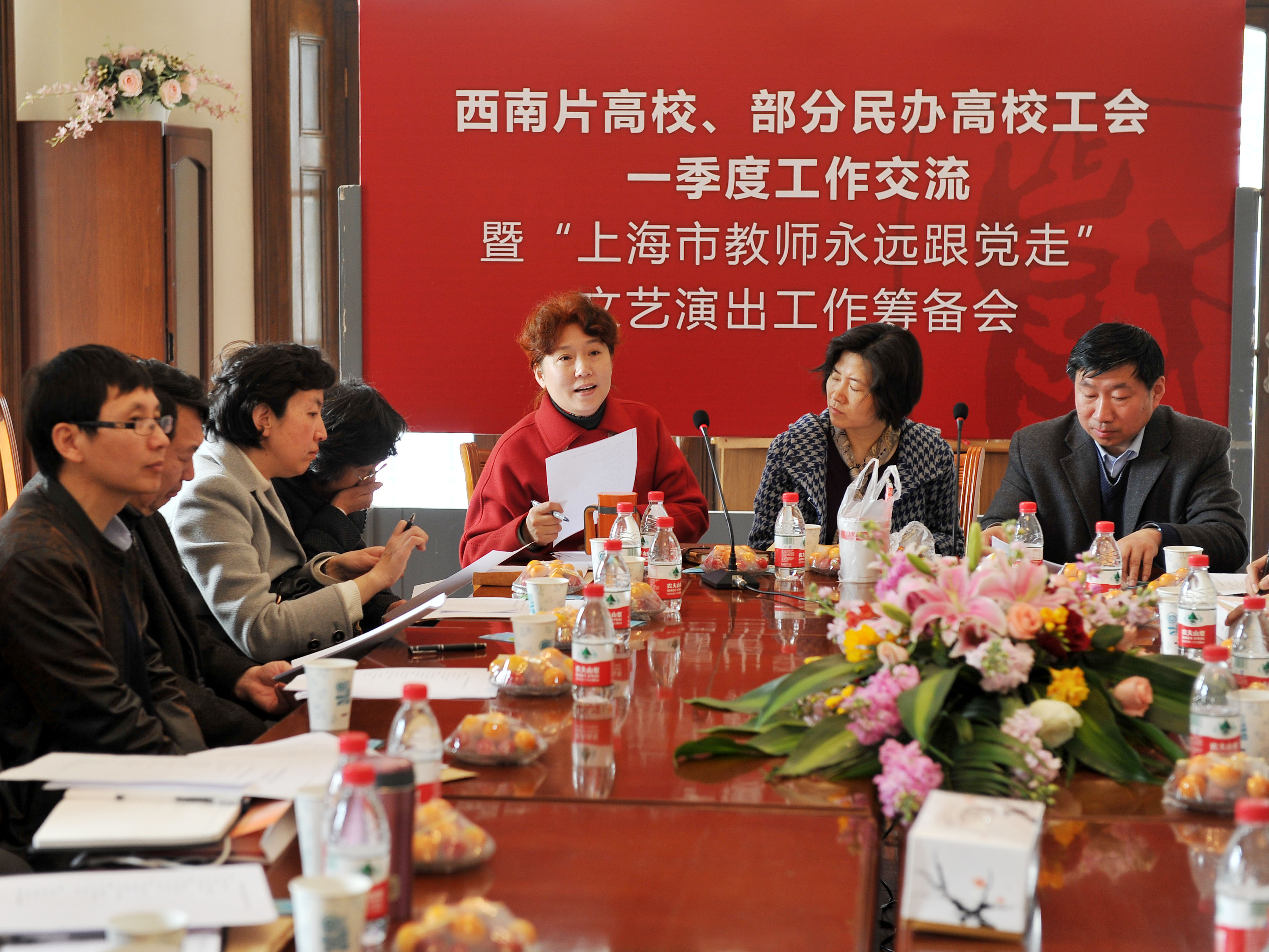 4月8日上午,西南片高校、部分民办高校工会一季度工作交流暨“上海市教师永远跟党走”文艺演出工作筹备会在开云足球首页官网下载佛西楼召开。上海市教育工会兼职副主席贾金平、宣教文体部副部长沈瑶、西南片高校、部分民办高校工会相关负责人等40余人出席了会议。