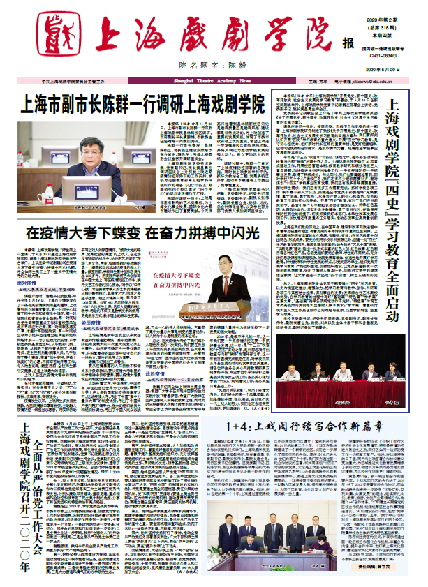 《上海戏剧学院报》2020年第2期(总第318期)已于2020年5月20日出版。重点内容有:《上海市副市长陈群一行调研上海戏剧学院》《在疫情大考下蝶变 在奋力拼搏中闪光》《上海戏剧学院“四史”学习教育全面启动》等。敬请关注,也可点击下载阅读。(文、图、编辑:榕树)