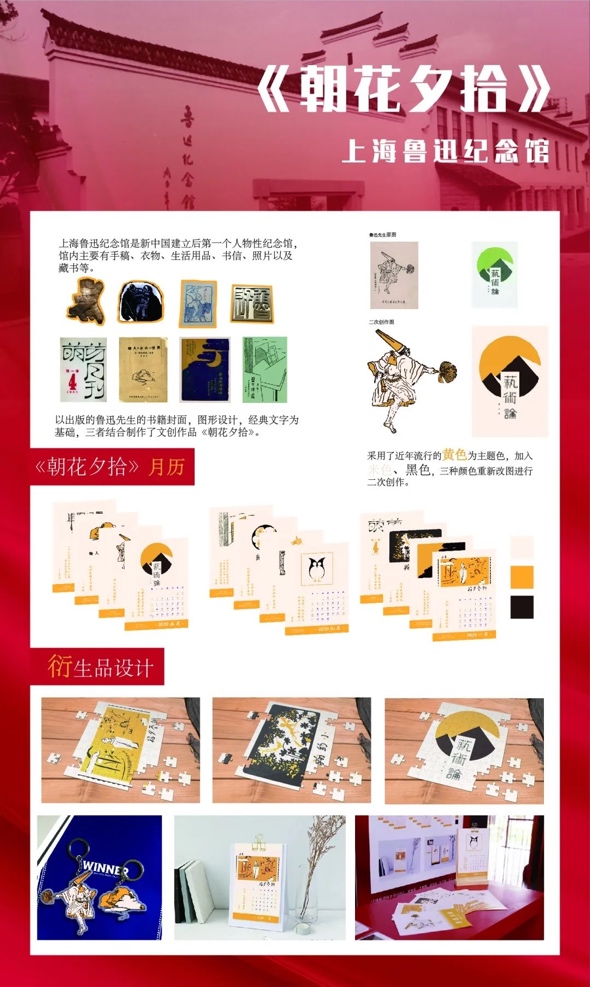 6月30日,在庆祝中国共产党成立99周年之际,第一届上海红色文化创意大赛颁奖暨第二届上海红色文化创意大赛启动活动在东方网举行。上海戏剧学院创意学院党支部选送的作品中有三组入围复赛,最终16级视觉传达设计专业朱宁星同学的《朝花夕拾》月历(鲁迅纪念馆文创)与吴逸卿同学的“春雨桃花红”雨具(龙华烈士纪念馆)2组作品获得了大赛入围奖,创意学院党支部获得优秀组织奖。