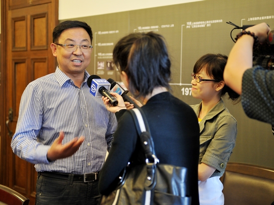 图为楼巍书记接受媒体采访