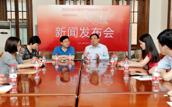 为迎接建党90周年,由我校倾力打造的大型多媒体情境朗诵作品《回响•回想》将于6月26日至7月1日在上戏剧院隆重上演。今天上午,《回响•回想》新闻发布会在佛西楼举行。党委书记楼巍出席,演艺中心副主任张军、该剧导演薛伟君参加,发布会由宣传部长张生泉主持。