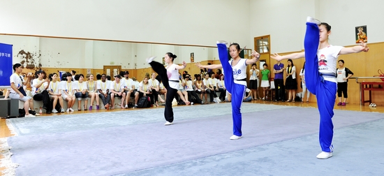图为戏校学生向留学生展示基本功