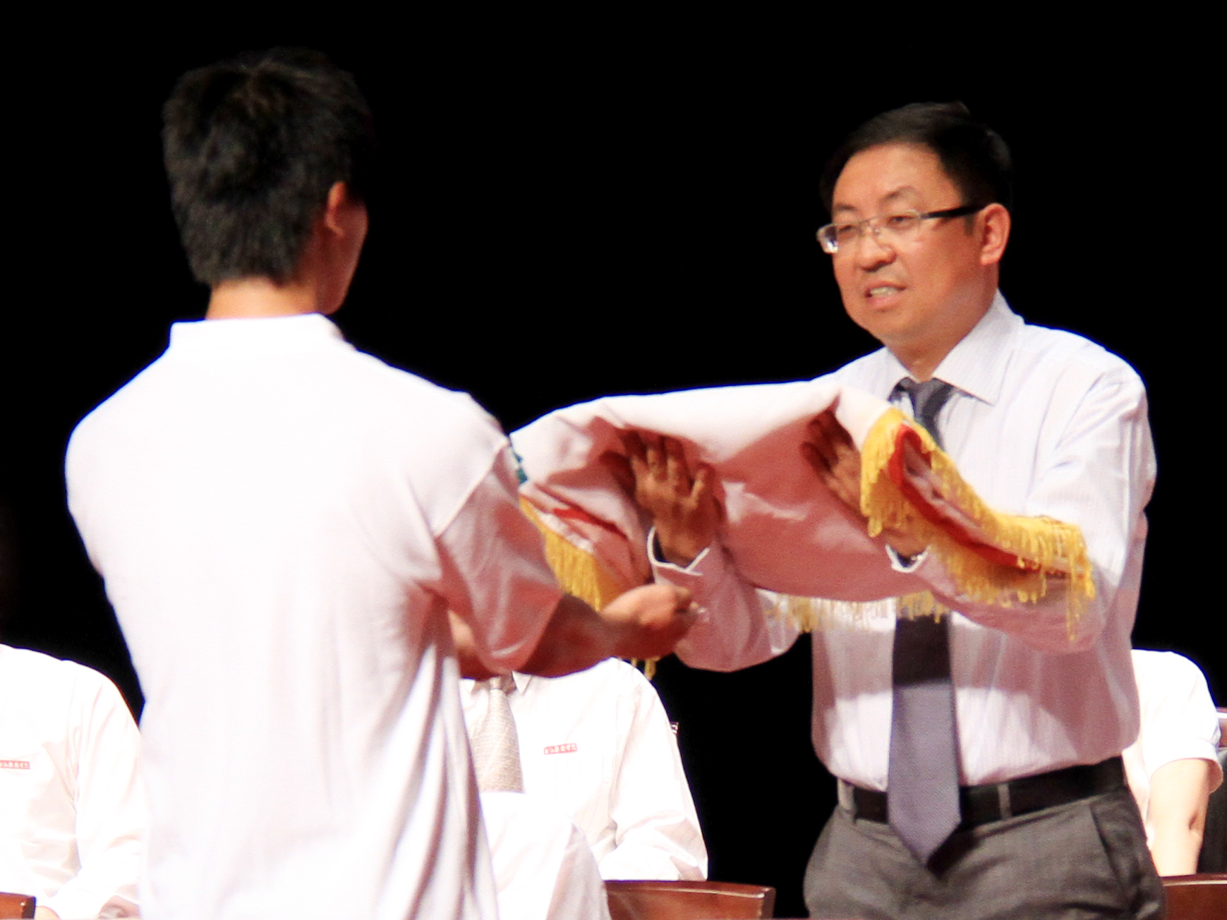 图为楼巍书记向新生代表传递校旗