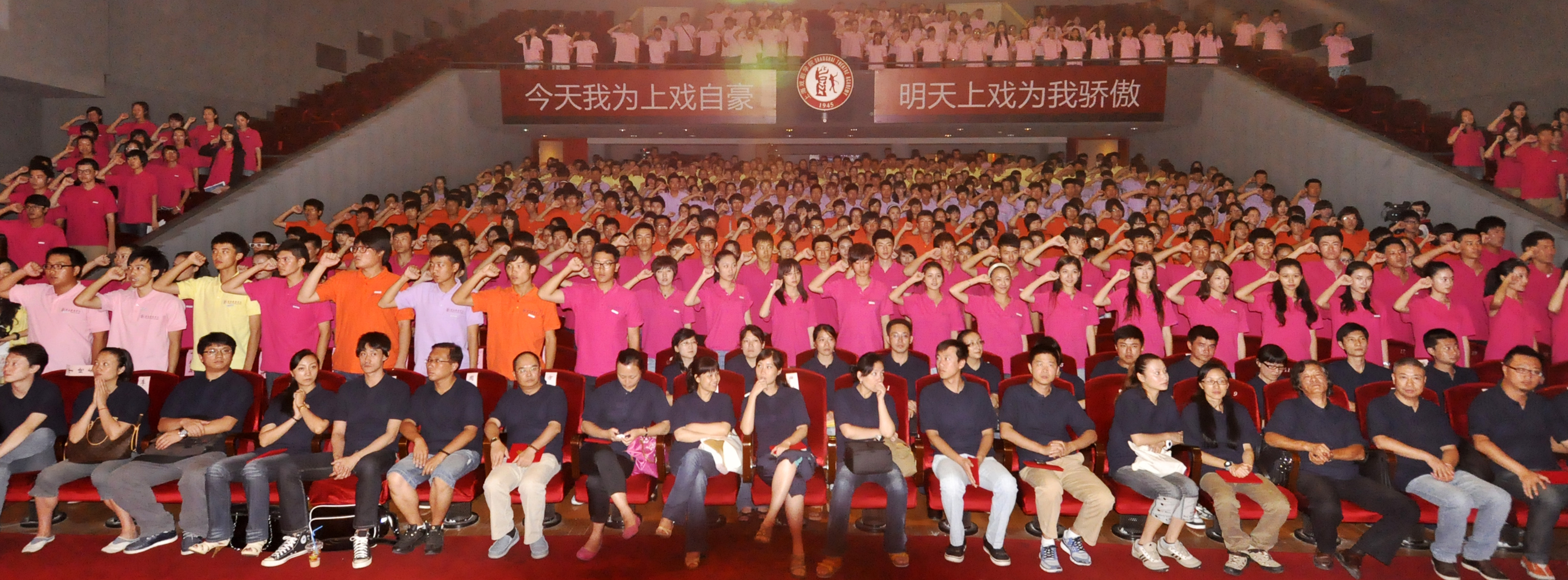 大会最后还举行了隆重的“升校旗、唱校歌”仪式,在校歌声中,老生代表将校旗经党委书记楼巍之手传递给新生代表,全体新生起立,集体宣誓:“我是上戏学生,我将胸怀远大理想,明确使命责任,务实好学,尊师守纪,修身立德,博学尚艺,塑造健全人格,追求艺术真谛,为服务国家文化事业发展,不断创新超越,努力续写辉煌!”校旗在庄严的校歌中冉冉升起,开学典礼顺利结束。