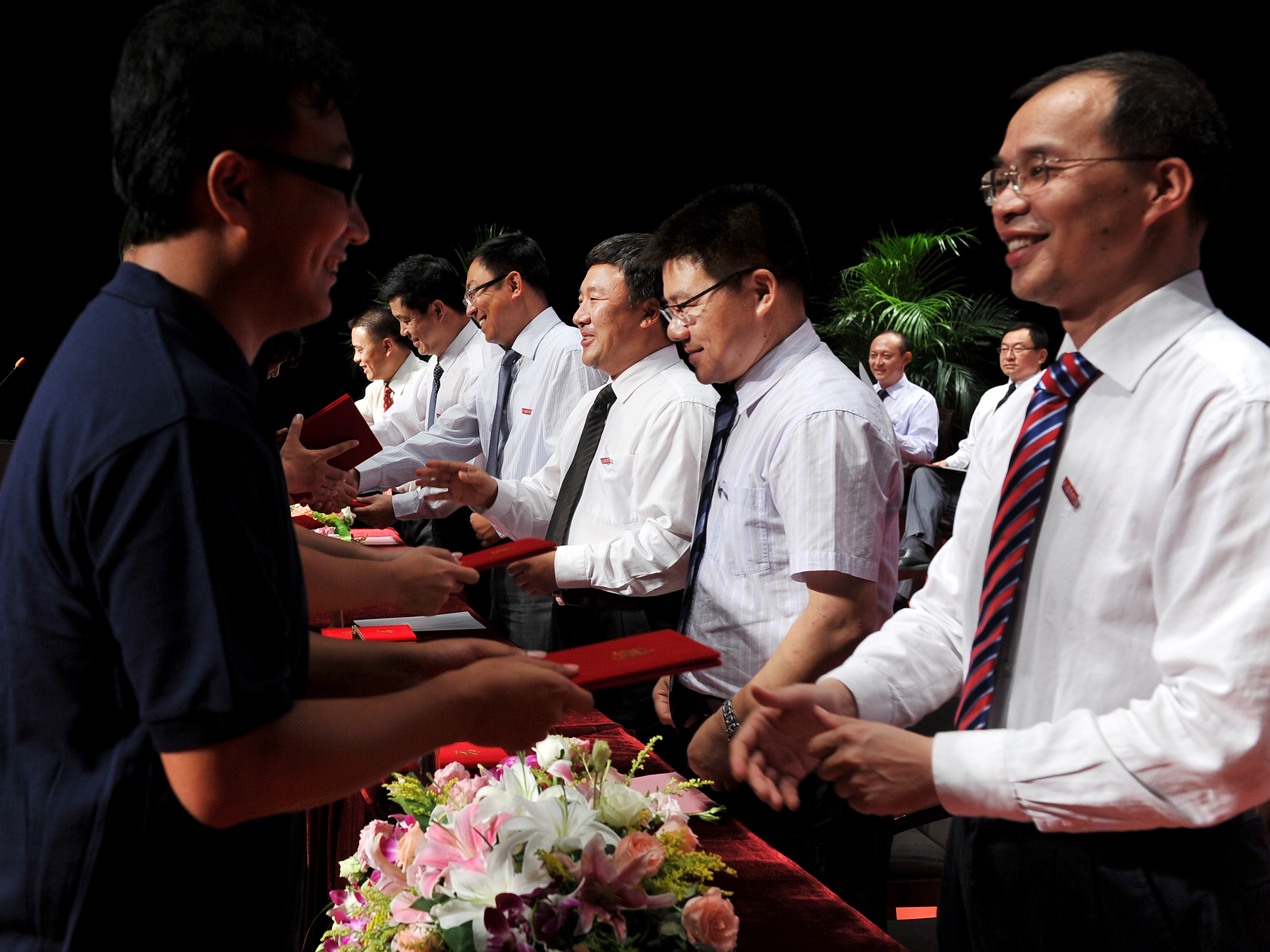 图为校领导向班主任颁发聘书