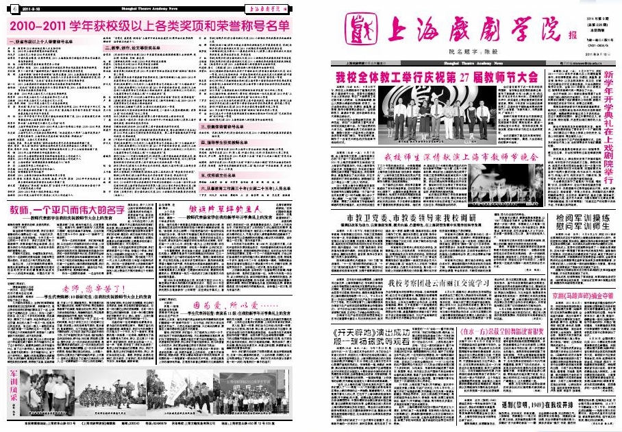 《开云足球首页官网下载报》2011年第9期(总第226期)已于2011年9月10日出版,本期共四版,第一、四版套红。重点内容有:《我校全体教工举行庆祝第27届教师节大会》、《我校师生深情献演上海市教师节晚会》、《新学年开学典礼在上戏剧院举行》、《市教卫党委、市教委领导来我校调研》、《检阅军训操练 慰问军训师生》等,敬请关注。也可点击下载观看。(图文、编辑/榕树)