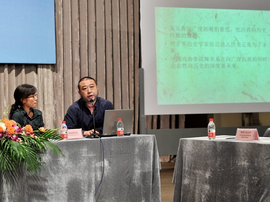 中国戏曲学院的党宁则另辟蹊径,从哲学美学的角度介绍了多元文化。他说不能单一的用戏曲学去解读戏曲,戏曲是一个多元化的产物,是多方共同作用的结果。他提出了演出空间的概念,指出戏曲要想走向未来用这种方式解决戏曲的时空问题 也是有效的。最后,他用学生作品分析了中国戏曲的审美特征,是大家更具体的理解中国戏曲对美的理解。