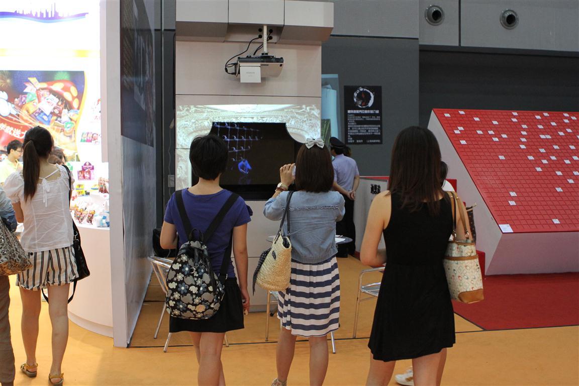 而本次由创意学院张敬平老师和姜海萍同学共同合作完成的作品《鲤鱼跳龙门》也是得到了广泛关注。该作品是文化部课题《多点触摸互动娱乐展示项目》的成果之一。作品设计了一个游戏的场景,利用对人体的识别来控制画面中的物象,使参与者完全无须借助任何外界物体变可以轻松参与互动。游戏者从老人到小孩,从商业人士到学生都对该作品表现出极大认可,更有甚者连续三天前来试玩不同版本的作品。