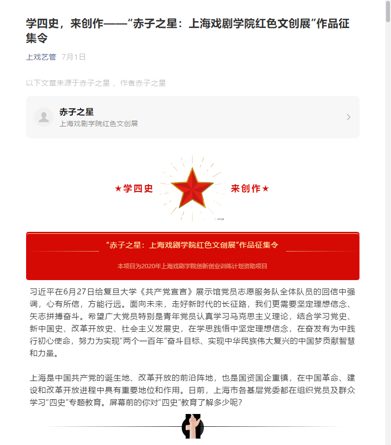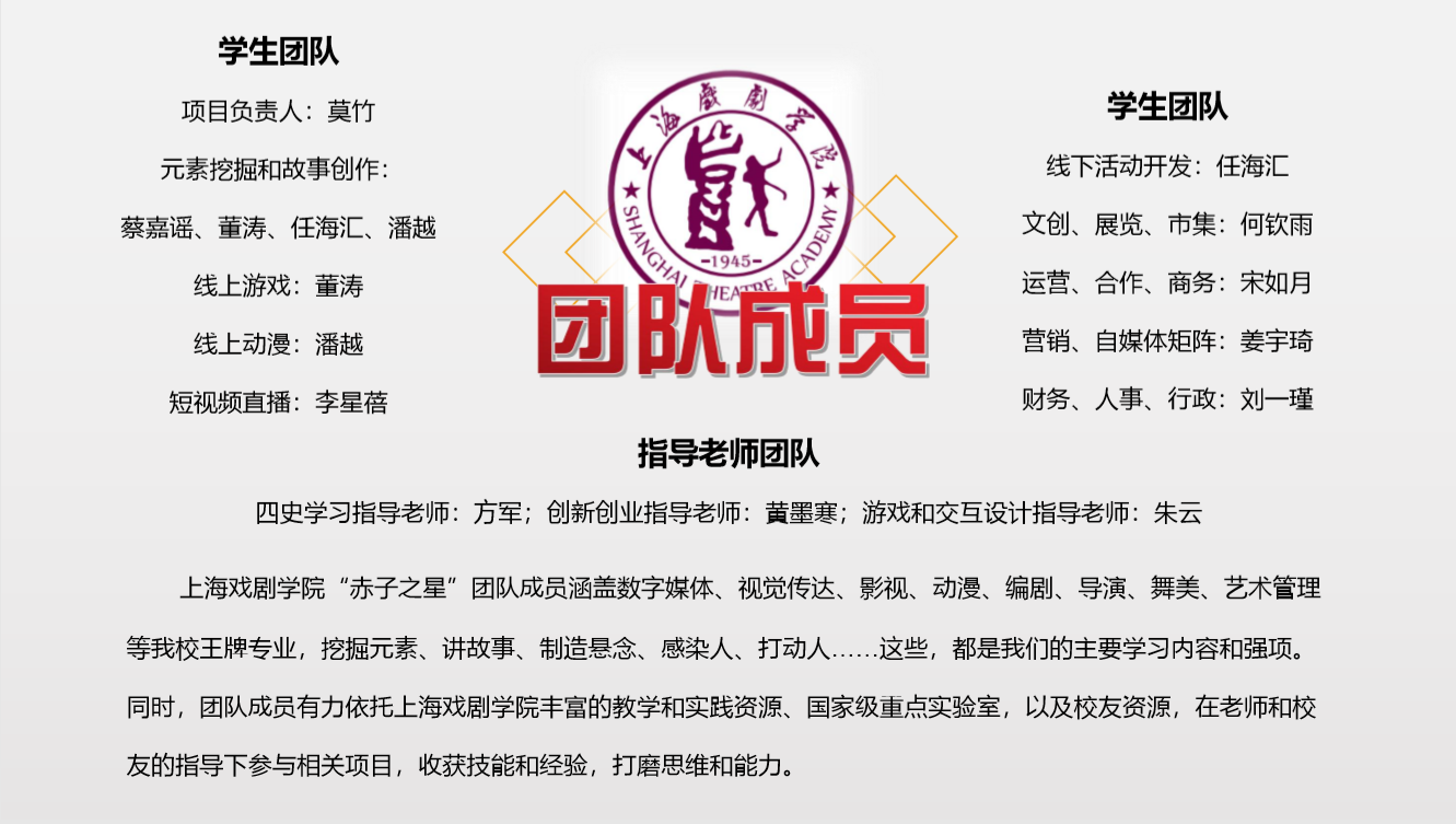 团队集合了创意学院、戏文系、电影电视学院共3个院系4个专业的本科生,在指导老师方军、黄墨寒、朱云的带领和钱子君等校友的指导帮助下,作为创意学院党支部“课程思政整合平台”支持下的“一院系一品牌”项目,结合所学专业、自身特长和创意想法,用年轻人喜爱的线上线下多元形式,对红色精神进行深入挖掘和思考,赋予四史学习新的角度和活力。