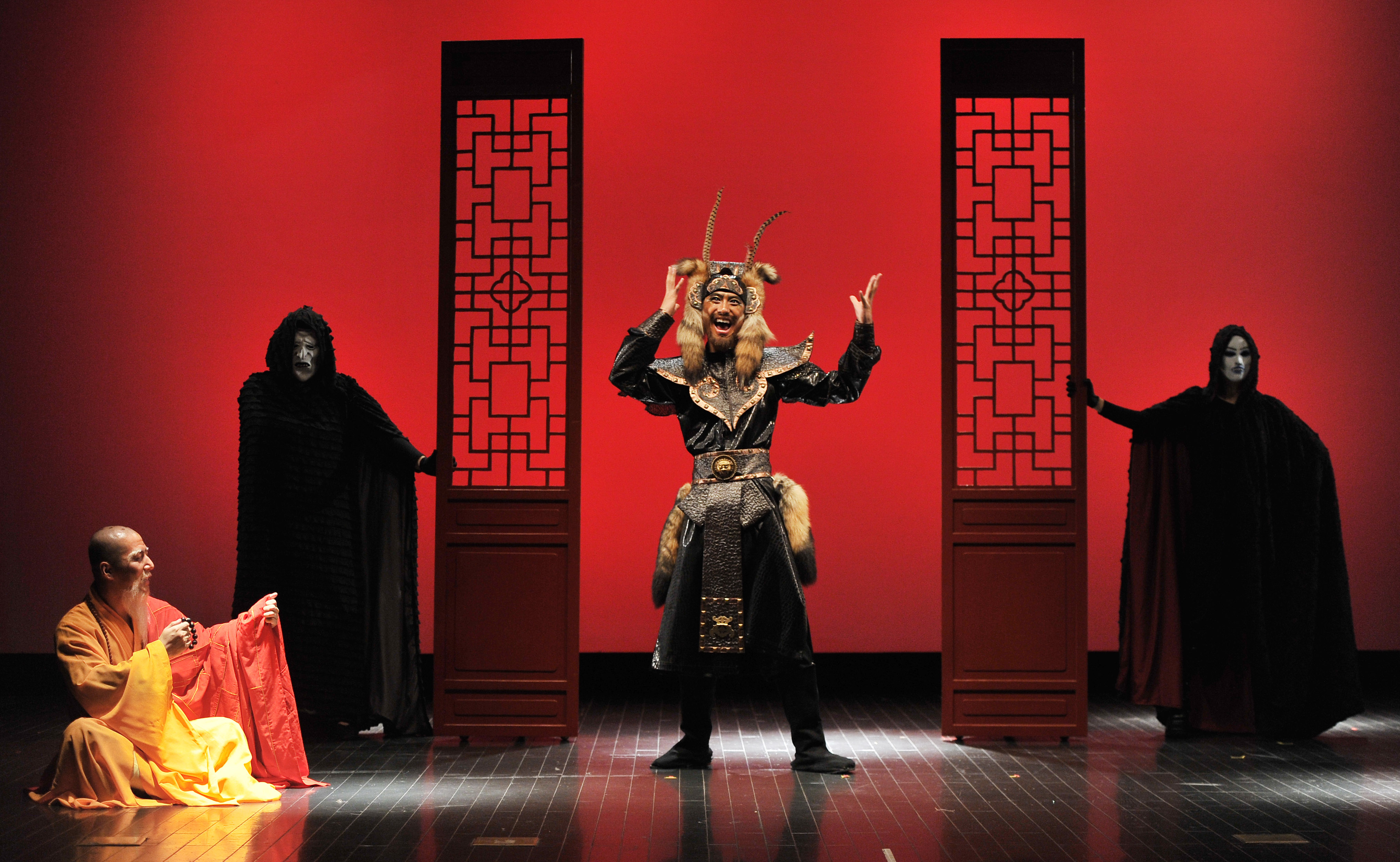 整个戏看下来,给我留下印象最深刻的是每场换景的过程,都是由张生的书童通过舞蹈、肢体语言或内心活动来讲幕拉开或合上的,这一细节使整出戏剧的演出完整,每一幕的衔接延续了上一幕人物的情感和内心纠葛,可以使观众整一个进入完整的情境中,而没有置身事外的感觉。在人物的走为上,也是符合中国戏曲的传统方式,打破空间和时间的界限,这也算是对中国传统戏曲的一种尊重。
