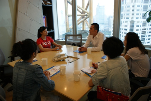 参观结束后,叶经理和研究生会成员在小会议室进行了近一小时的桌面洽谈,叶经理对研究生同学提出的有关实习、就业、岗位需求等问题逐一进行了答疑解惑,并热情欢迎优秀研究生前去实习或竞聘就业,研究生会主席孟晶晶与叶经理在紫藤学术周和克顿专场招聘等合作项目上达成了初步共识。如果说,2010年7月,研究生会和工商静安分局实现共建合作还是一次资源共享、优势互补的实践尝试,那么这次与克顿传媒的洽谈则进一步在学术研究和创作实践上为我校研究生发展开拓了新的空间。