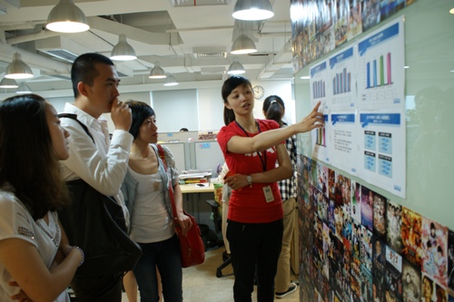 叶晓燕经理首先带领研究生会成员参观了公司的办公场所,并详细介绍了公司的工作流程和发展方向,让大家切身感受到公司和谐的工作氛围和卓越的企业文化。高效的运行团队和专业化的电视剧评估是我们对其最大的印象,克顿传媒在电视剧策划、制作方面有其独特的运营之道,根据叶经理的介绍,研发中心设有“淘金”、“剧宝”、“直观”和“阿波罗”四个电视剧评估和优化小组,提供从创意、到素材、梗概、直至成片的全方位的快速评估,数据中心是对各类节目特别是电视剧进行长期专业的分析研究,准确的评估系统和数据是克顿决定投拍电视剧的重要依据。