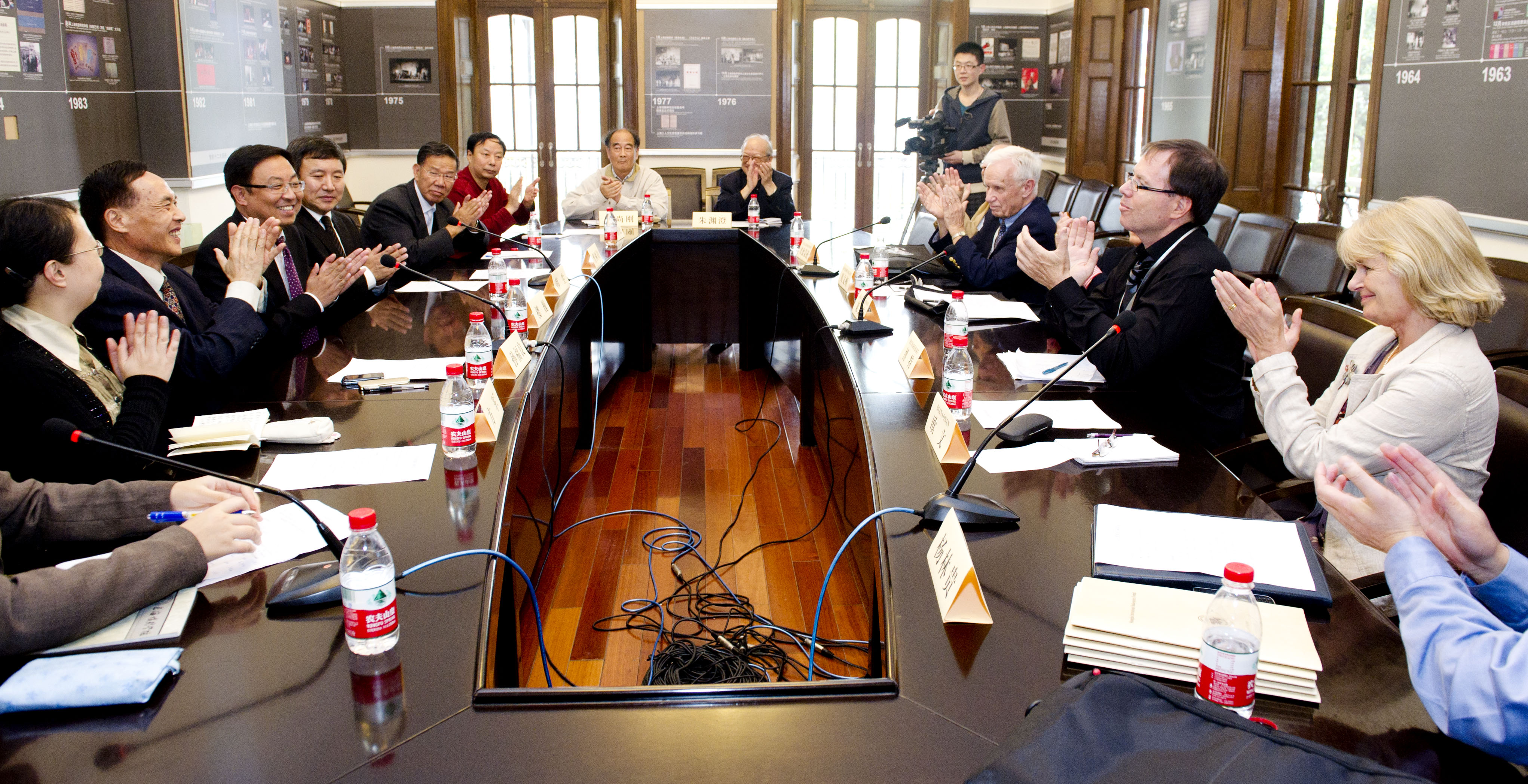 带着不断同中国莎学界深化交流与合作的美好愿望,国际莎学会代表团此次来到了在中国莎学建设史上具有里程碑意义的上戏。楼巍书记向来宾表示,上戏是中国莎剧演出和莎学研究的重要基地,当年我们尽了应尽的责任,今后还要继续作出自己的贡献,希望国际莎学会给予支持和指导。韩生院长在会谈中指出,莎剧节的举办是中国文化向世界开放的重要起点,标志着中国文化艺术领域开始与世界全面接通,影响至今犹在。莎士比亚是说不尽的,超越了地域、民族和时代,既连接着传统,又非常具有现代性。对于艺术院校,莎士比亚更是永恒的主题,上戏今后将大力推进莎学事业的创新发展,并为此提供服务和支持,因此今天的相聚既是对历史的纪念,又是一个新的起点。