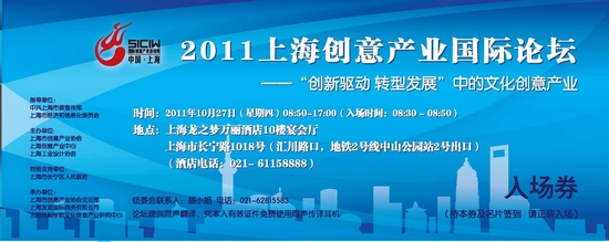 2011上海创意产业国际论坛,由中共上海市委宣传部、上海市经济和信息化委员会作指导单位,上海市创意产业协会等单位主办。论坛的主题是“‘创新驱动转型发展’中的文化创意产业”。论坛组委会邀请国内外政府官员、企业领袖、专家学者、业界人士集聚一堂,交流探讨在“创新驱动、转型发展”的大背景下,上海文化创意产业如何破解难题,创造具有可持续性的本土实践。