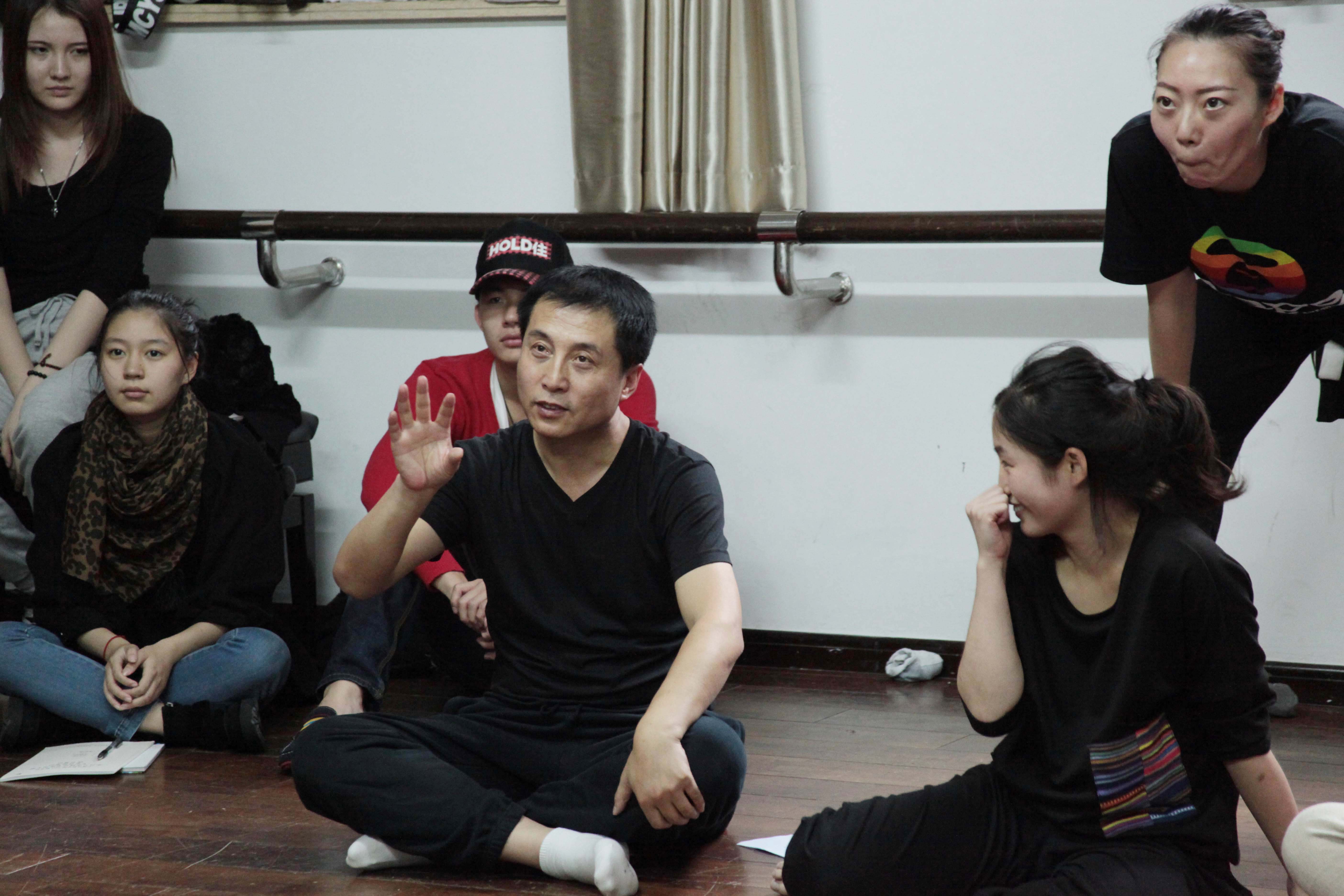 他用音乐将学生带入一个只属于他们的世界,让他们用身体去触碰音乐,这是演员的音乐性,不用于煽情,而是一种自然的表达。他亲切地纠正学生僵硬的姿势,告诉他们就像身上带了珠子一般,用身体去抓音符。让他们在地板上随着节奏踏步,把身心完全投入于这个环境中。在传送带练习中,同学们放开了自己,注意力高度集中,反应力也很强,他通过学生两次的变化强调了发展,去感知更细腻的东西和情感。