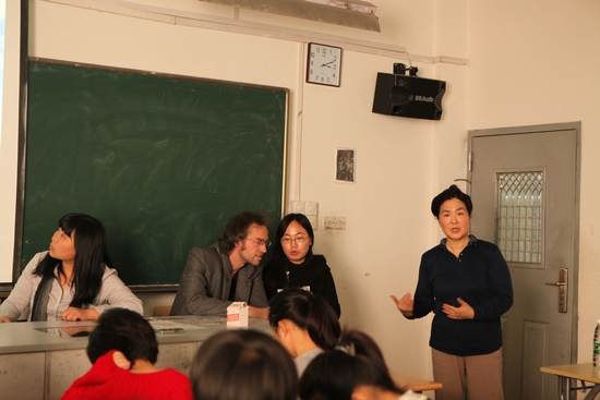 图为方方老师向前来听讲座的同学介绍两位德国专家