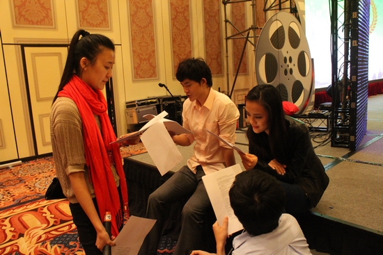 图为我校担任颁奖晚会主持人的四名学生正在认真做准备