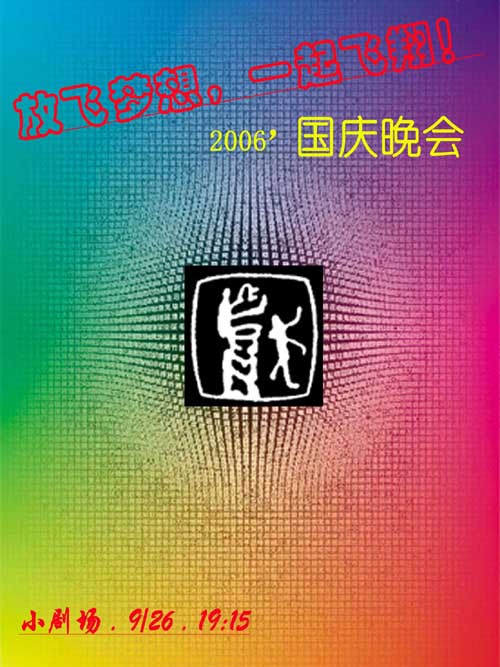 为迎接国庆佳节的到来,由上海戏剧学院团委主办,学生会承办的迎国庆57周年文艺晚会《放飞梦想 一起飞翔》将于9月26日晚19:15在上戏小剧场内精彩献演,欢迎广大师生光临。