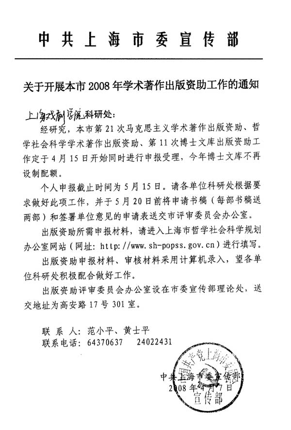 现转发中共上海市委宣传部关于开展上海市2008年学术著作出版资助工作的通知。详情请见附件。