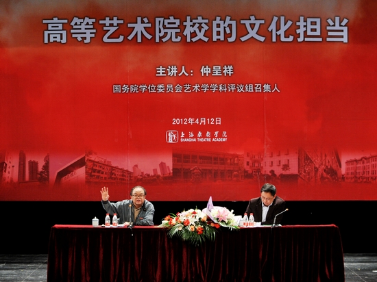 当代著名文化学者仲呈祥教授4月12日应邀来我校做题为《高等艺术院校的文化担当》学术报告。在学术报告开始前,仲呈祥客座教授受聘仪式在上戏剧院隆重举行。楼巍书记为仲呈祥教授颁发聘书,并佩戴开云足球首页官网下载校徽,仪式由宫宝荣副院长主持。