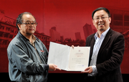 图为楼巍书记为仲呈祥教授颁发聘书