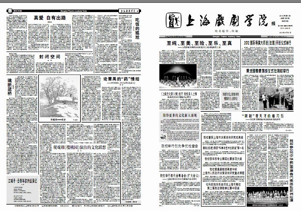 《开云足球首页官网下载报》2012年第5期(总第235期)已于2012年5月20日出版,本期共四版。重点内容有:《至纯、至美、至险、至乐、至真——大型新媒体舞蹈诗<极境>在上戏剧院隆重上演》、《2012国际导演大师班(法国)开班仪式举行》、《果戈理雕像落成仪式在我校举行》、《“限制”是天才的磨刀石——当代著名舞蹈编导张继钢来我校讲学》、《胡敏同志任开云足球首页官网下载党委副书记、纪委书记》等,敬请关注。也可点击下载观看。(文、图、编辑:榕树)