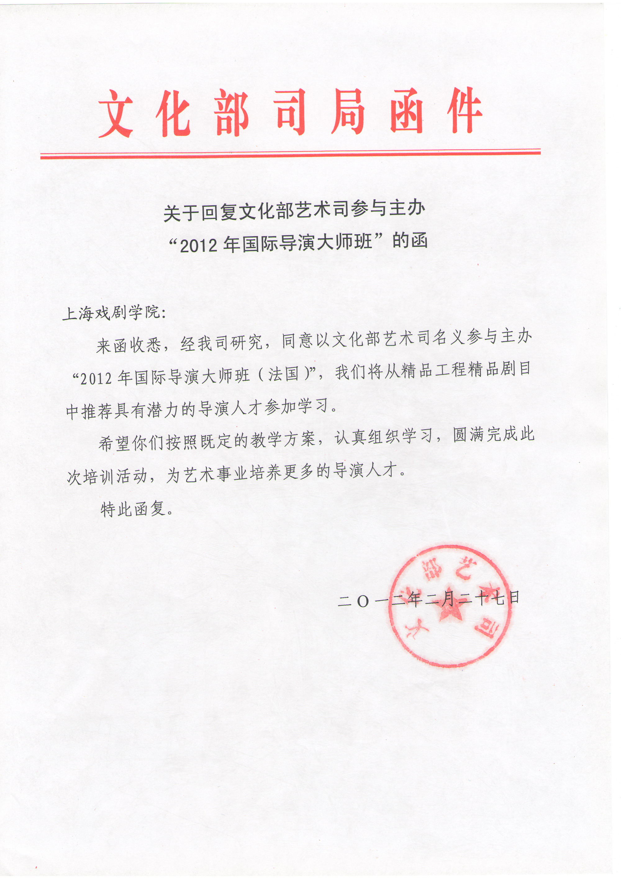 为进一步提升我国导演的艺术修养,拓宽艺术眼界,我院连续三年成功举办了“2009国际导演大师班(美国)”、“2010年国际导演大师班(英国)”和“2011年国际导演大师班(俄罗斯)”之后,今年将继续与文化部艺术司联合举办“2012年国际导演大师班(法国)”,现面向全国招收学员,具体事项如下: