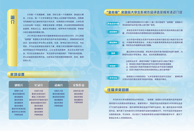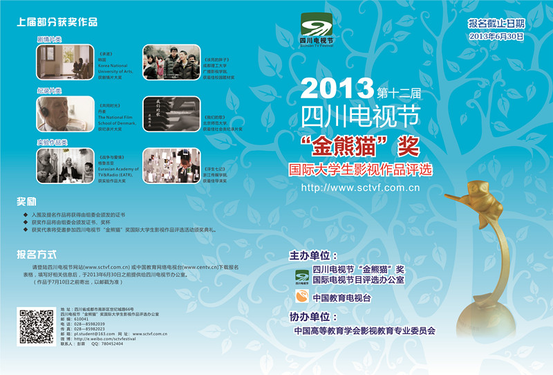 入围节目将免费在2013(第十二届)四川电视节“金熊猫” 奖国际大学生影视作品评选刊物上进行推广宣传。