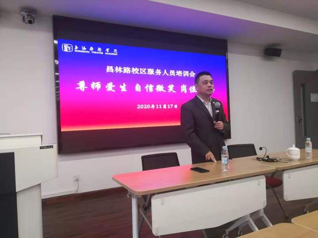 2020年11月17日下午1:00,上海戏剧学院昌林路校区运行保障中心邀请上海戏剧学院党委副书记、副院长张伟令为行政、物业、安保、食堂及宿管等工作人员作了主题为“尊师爱生、自信微笑、岗位敬语”的培训会。除须在岗位值守人员外,各部门三十余人参加了此次培训活动。