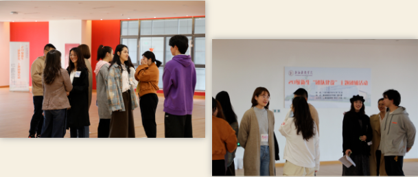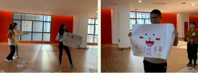 在第四轮团队建设活动里,两组同学给自己的队伍取名为“人狠话不多队”和“我们说的都‘队’”,大家互帮互助,共同制定了团队队长、队名、队歌、口号等……两支队伍火药味十足,督促彼此,精彩的完成了这一轮的任务。