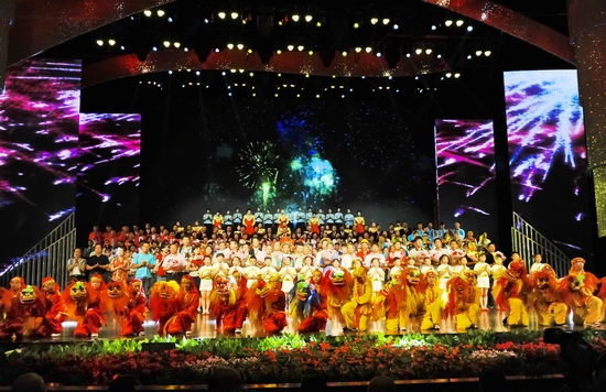 图为演出结束后领导和主创人员上台合影