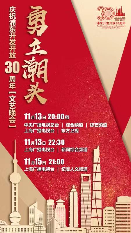 时值浦东开发开放30周年之际,《勇立潮头——庆祝浦东开发开放30周年文艺晚会》于11月13日在上海大剧院隆重举办。晚会由中共上海市委、上海市人民政府和中央广播电视总台主办,上海市浦东新区区委、浦东新区人民政府、上海市委宣传部、浦东新区区委宣传部承办,上海广播电视台承制。