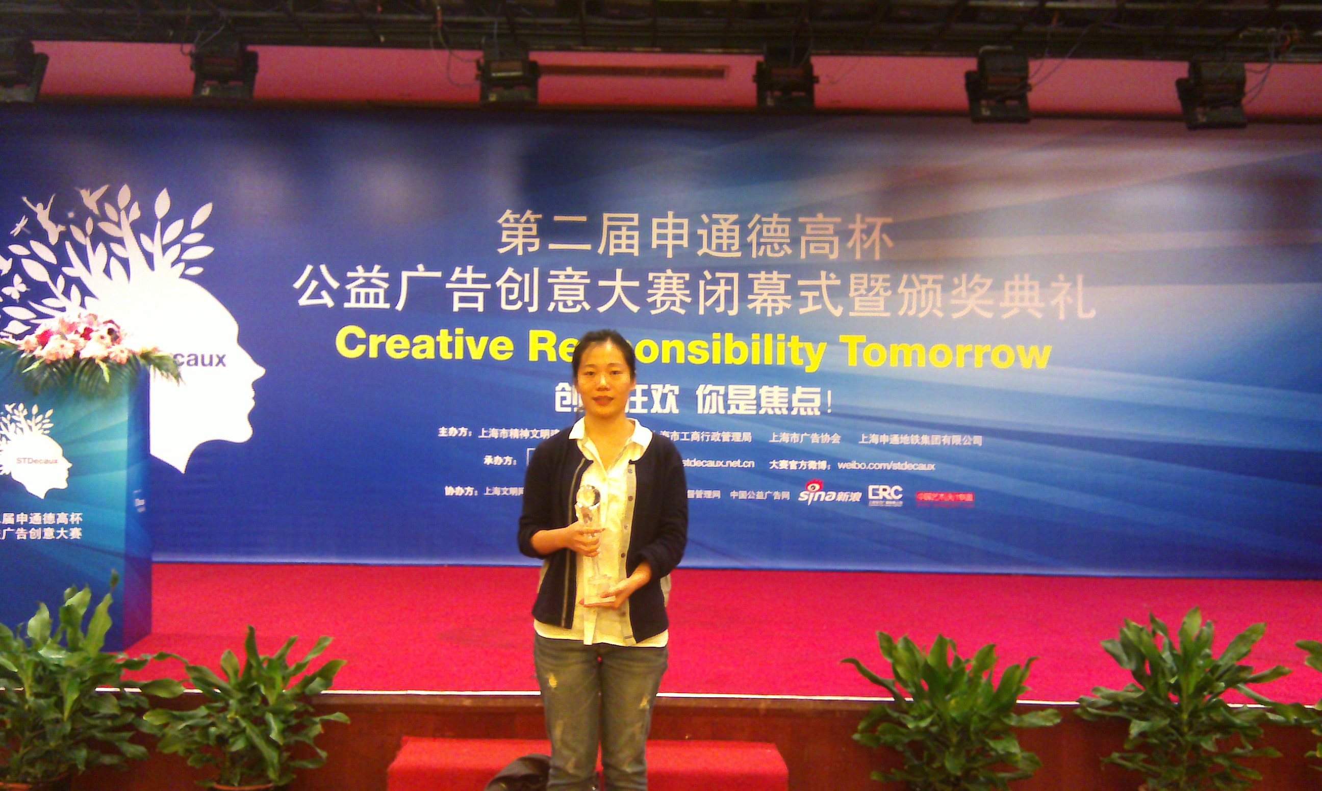 2012年10月,在由上海市精神文明建设委员会办公室、上海市工商行政管理局、上海市广告协会、上海申通地铁集团有限公司共同组织开展的第二届“申通德高杯”公益广告创意大赛中,我校设计学学科教师施�设计的公益广告“关注食品安全之番茄篇”喜获专业组银奖,并受主办方邀请参加颁奖盛典。