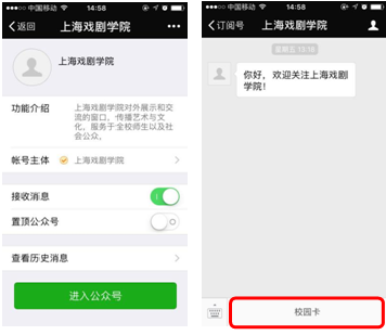 关注之后可以看到公众号下方有校园卡字样,点击登录后绑定校园卡即可充值、查询消费明细和挂失卡片。密码为身份证号后六位。