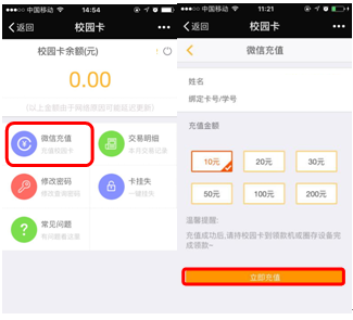 学校新的校园一卡通系统已经开通自助补卡和微信充值功能。请各位同学使用。以下事项请各位同学注意: