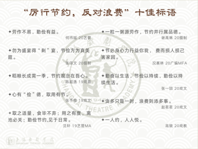 随着“寓俭于文、表勤达艺”主题征文及书签设计大赛颁奖典礼暨学生讲堂圆满结束,“厉行节约,反对浪费”的系列活动也告一段落了。本次活动旨在引导同学们爱惜粮食、勤俭节约,培养健康的饮食习惯,树立良好的消费观念。相信同学们在接下来的学习生活中能常怀节俭意识,保持良好的生活习惯,争做勤俭上戏人。