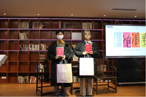 在设计类作品展示中,19级艺术管理专业的陈曦雯同学分享了她在光盘奖券设计上的独特构想;19级艺术学理论专业的林国鸿同学展示了他设计的书签,并分享了自己厉行节约的故事。各位获奖同学上台依次领奖,并获得了精致的奖品。