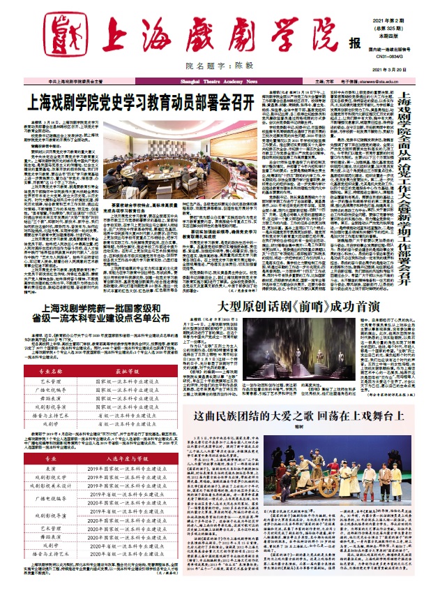 《上海戏剧学院报》2021年第2期(总第325期)已于2021年3月20日出版。重点内容有:《上海戏剧学院党史学习教育动员部署会召开》《上海戏剧学院全面从严治党工作大会暨新学期工作部署会召开》《上海戏剧学院新一批国家级和省级一流本科专业建设点名单公布》《大型原创话剧<前哨>成功首演》等。敬请关注,也可点击下载阅读。(文、图、编辑:榕树)